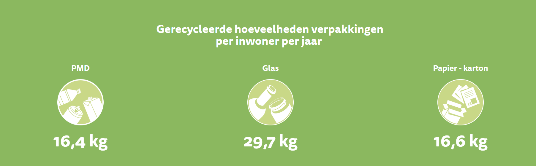In 2021 recycleerden we 29,7 kg glas, 16,6 kg papier-kartonverpakkingen en 16,4 kg PMD-materialen per inwoner. Het aandeel PMD, en dan voornamelijk plastic verpakkingsmaterialen, neemt daardoor verder toe, vooral door de verdere uitrol van de Nieuwe Blauwe Zak.